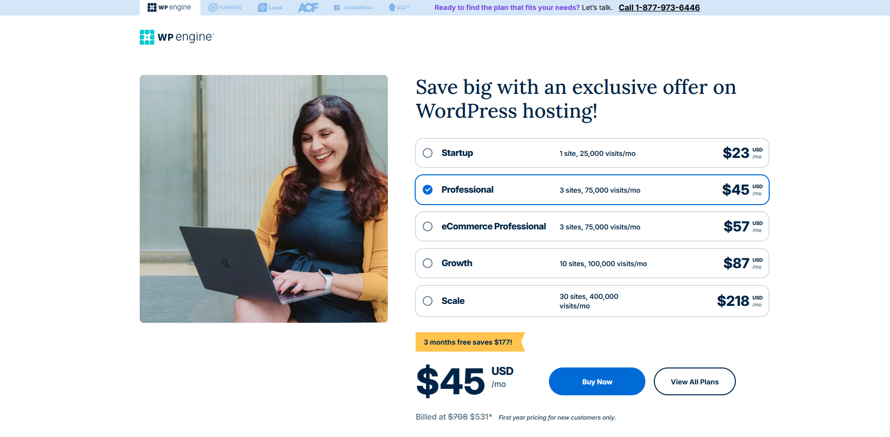 Pricing: Premium WordPress plans start at $2.49/mo (25 websites, 25GB storage). For an upgrade, Business is $3.29 (50GB), and higher “Cloud” plans ($7.49–$15.49/mo) offer more sites, visits, and storage.