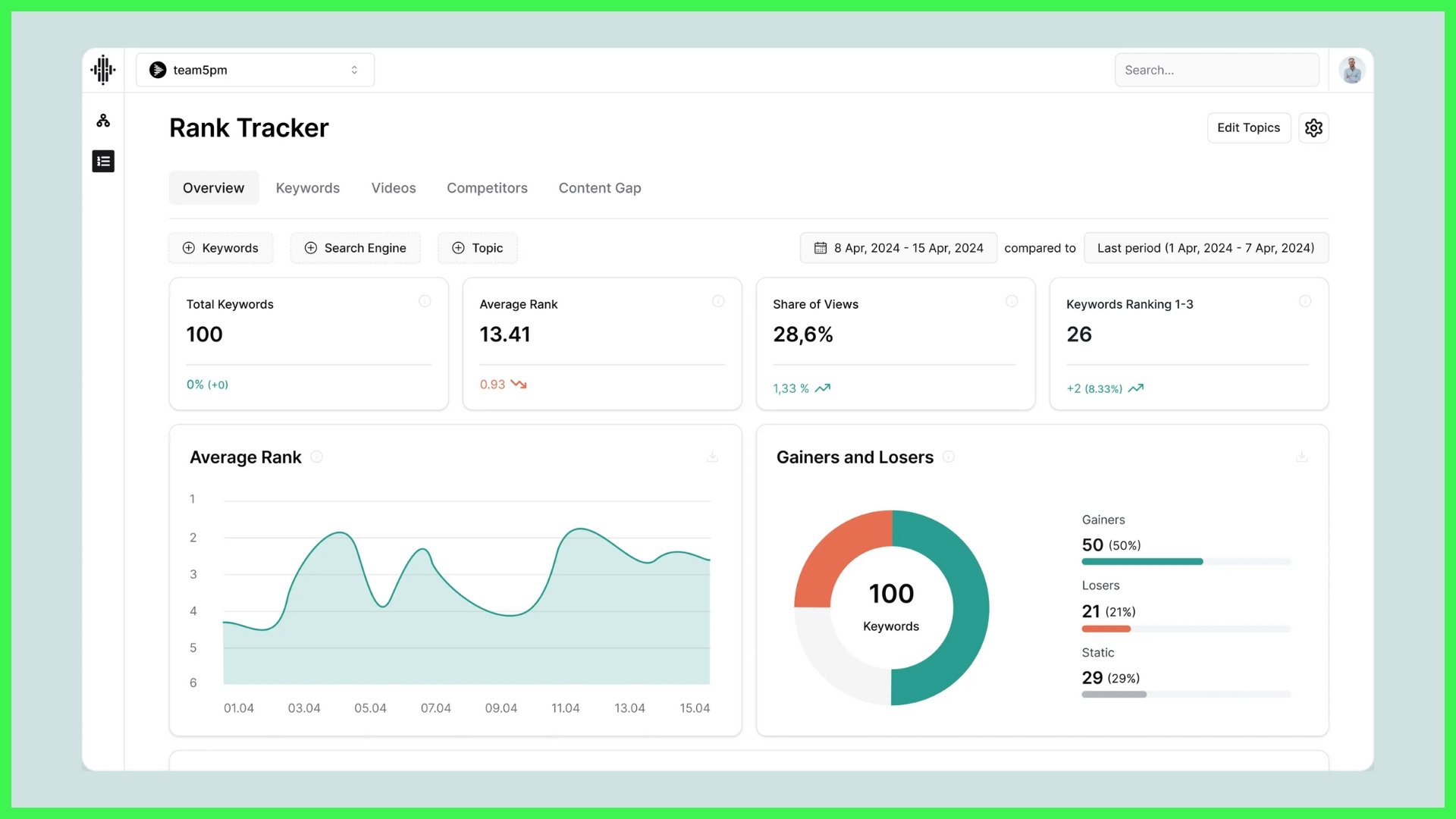 Rank trackers should help you understand where your channel ranks compared to competitors. This allows marketers to explore which keywords the competition ranks for.